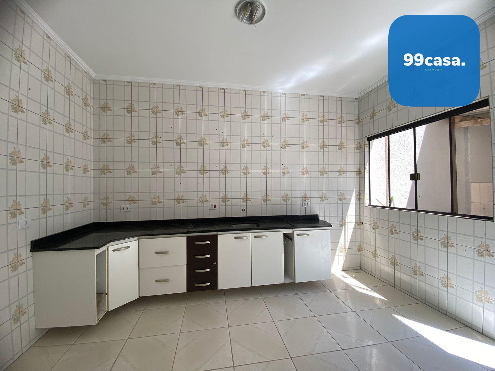 Cozinha espaçosa e com armários.