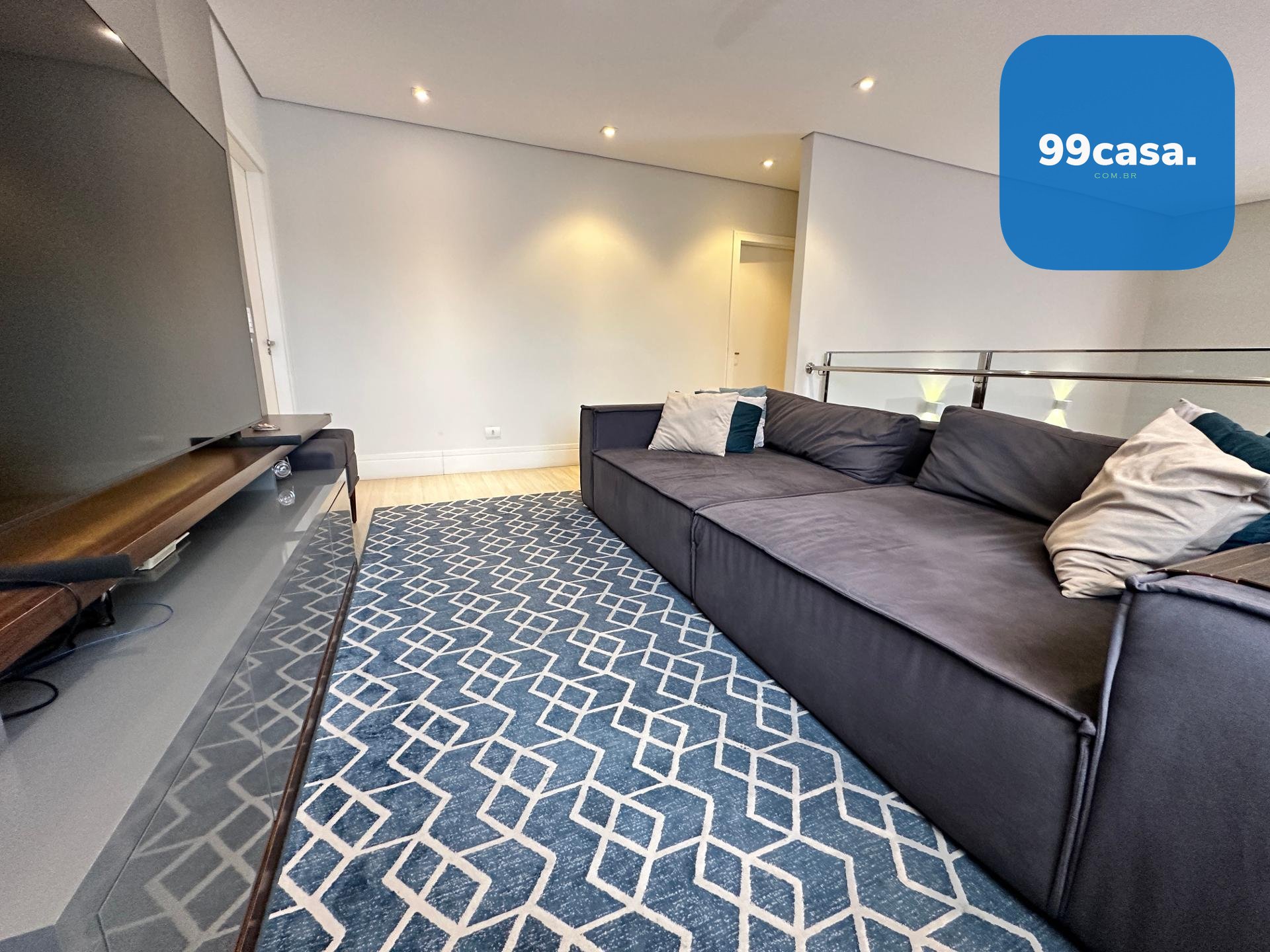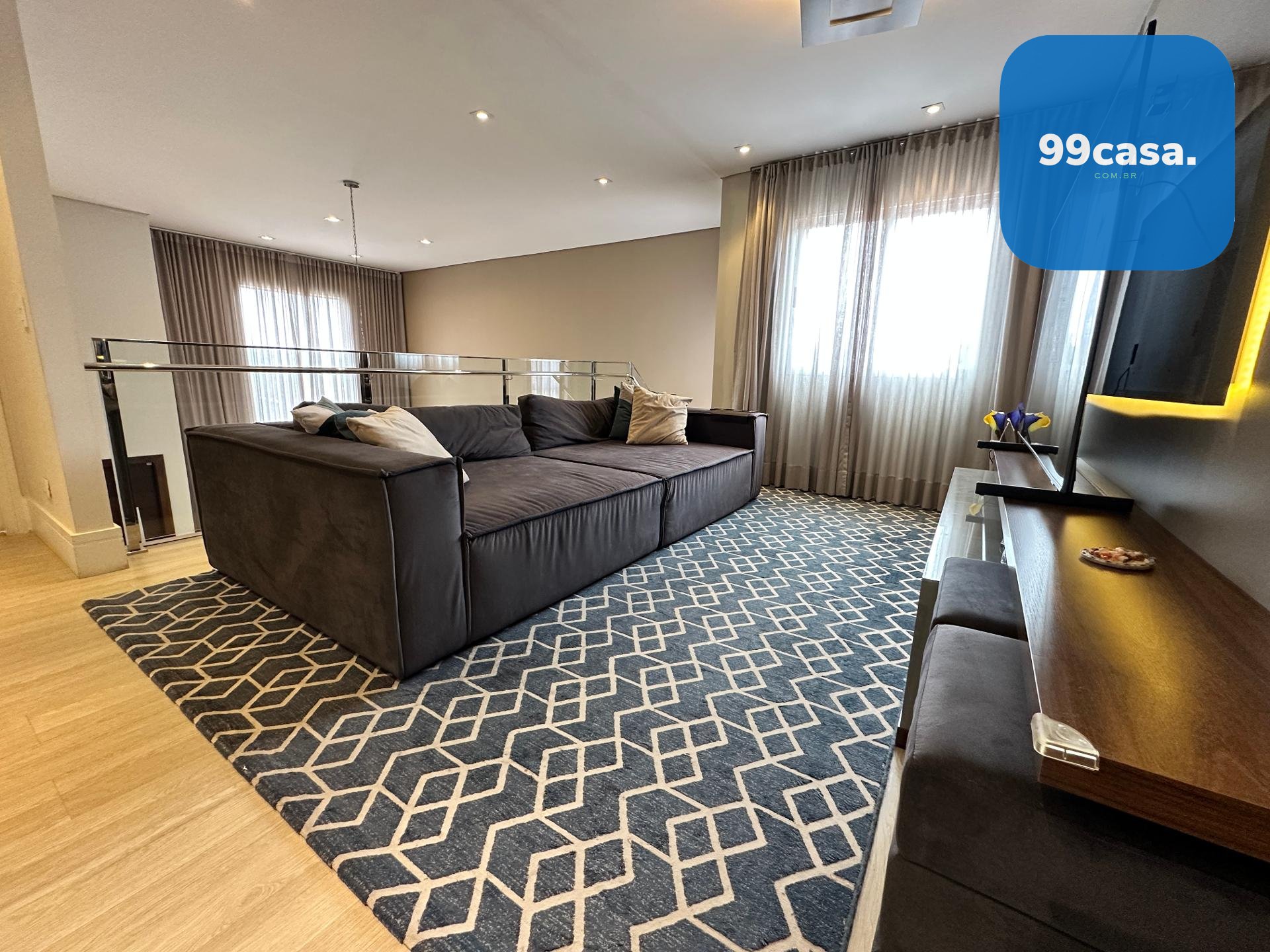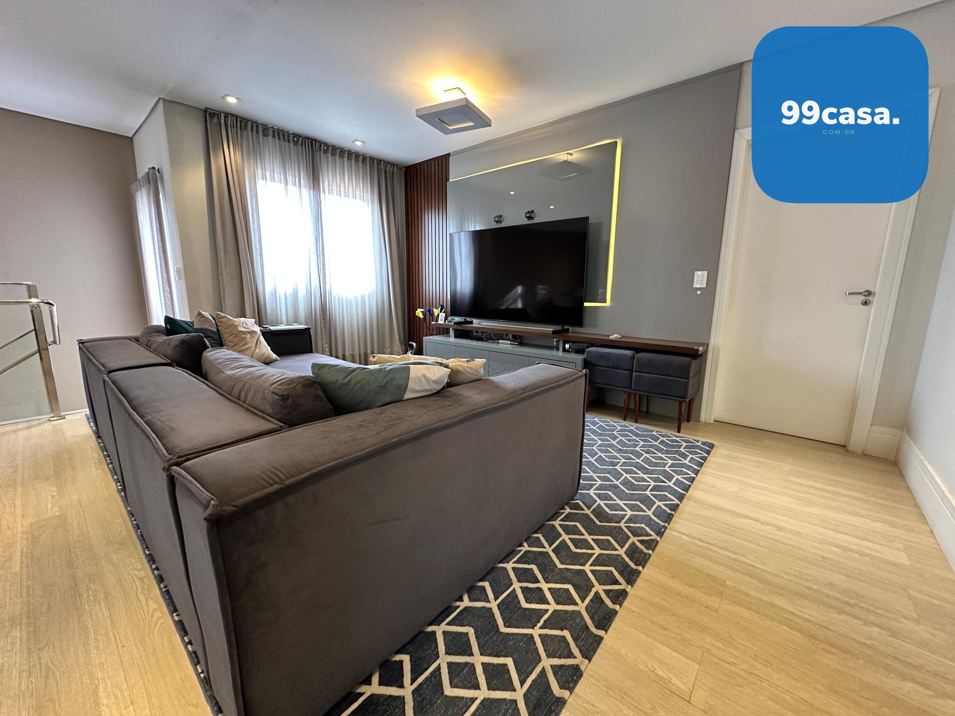 O sobrado conta com 4 quartos, sendo 3 suítes, além de 3 salas distribuídas em uma sala principal com pé-direito alto, sala de TV e uma sala estilo fitness. São 5 banheiros no total, incluindo lavabo. Possui cozinha planejada, escritório privativo, escada suspensa com design moderno, está semi mobiliado, com pisos em laminado e porcelanato, lavanderia independente e depósito.