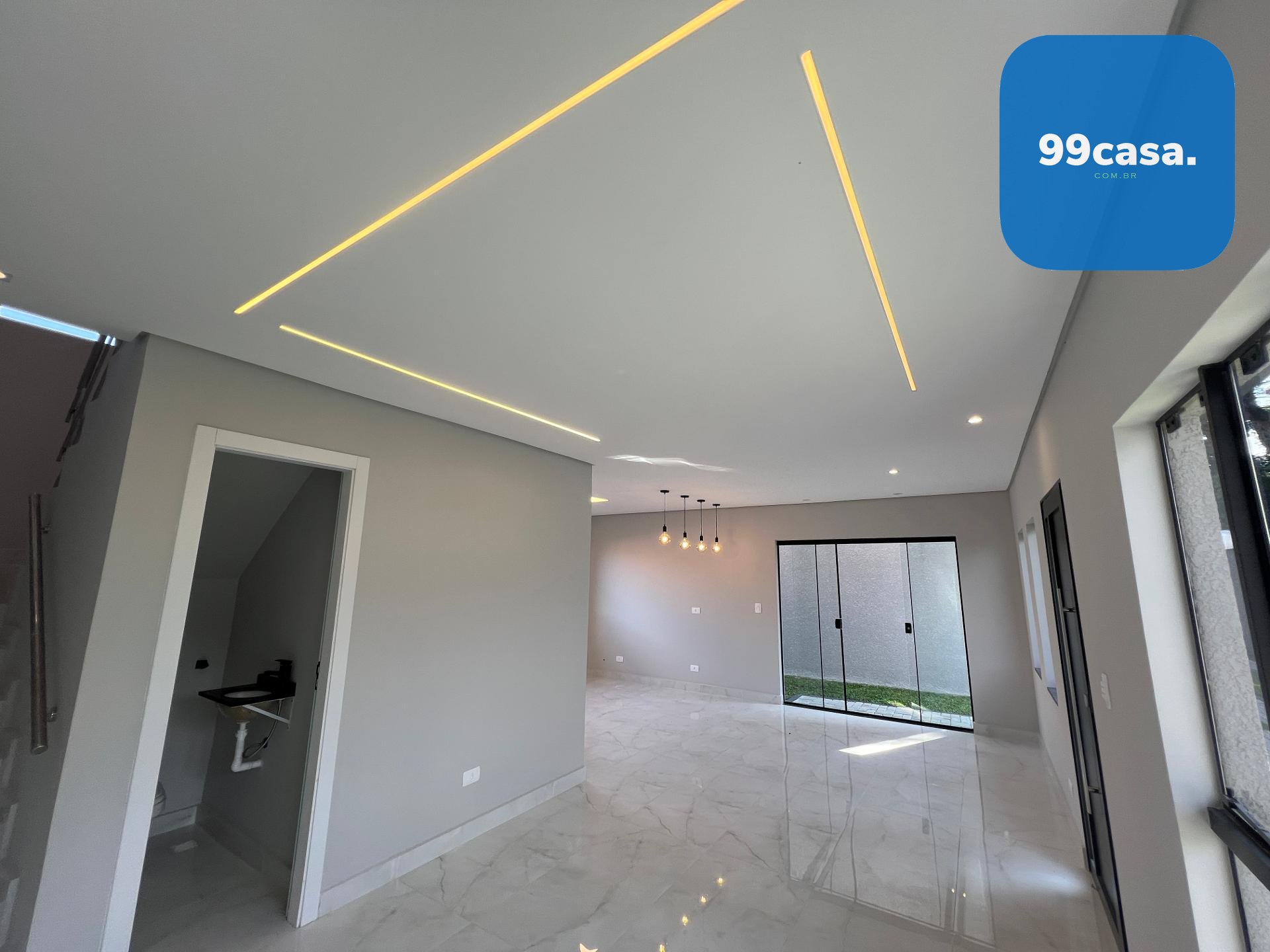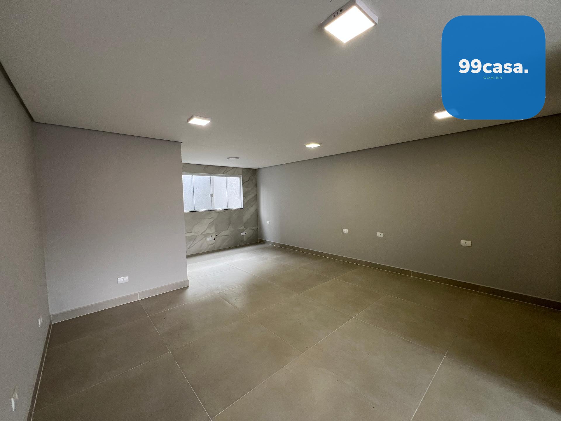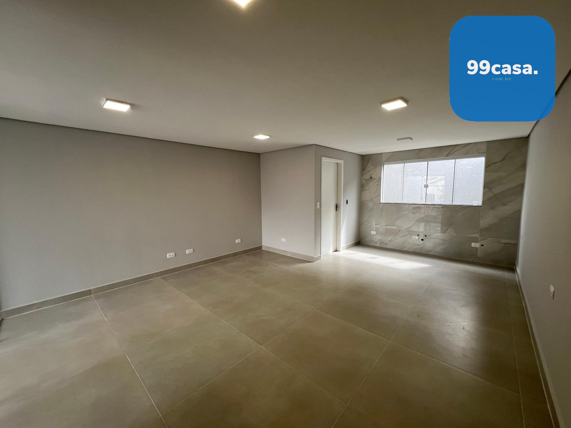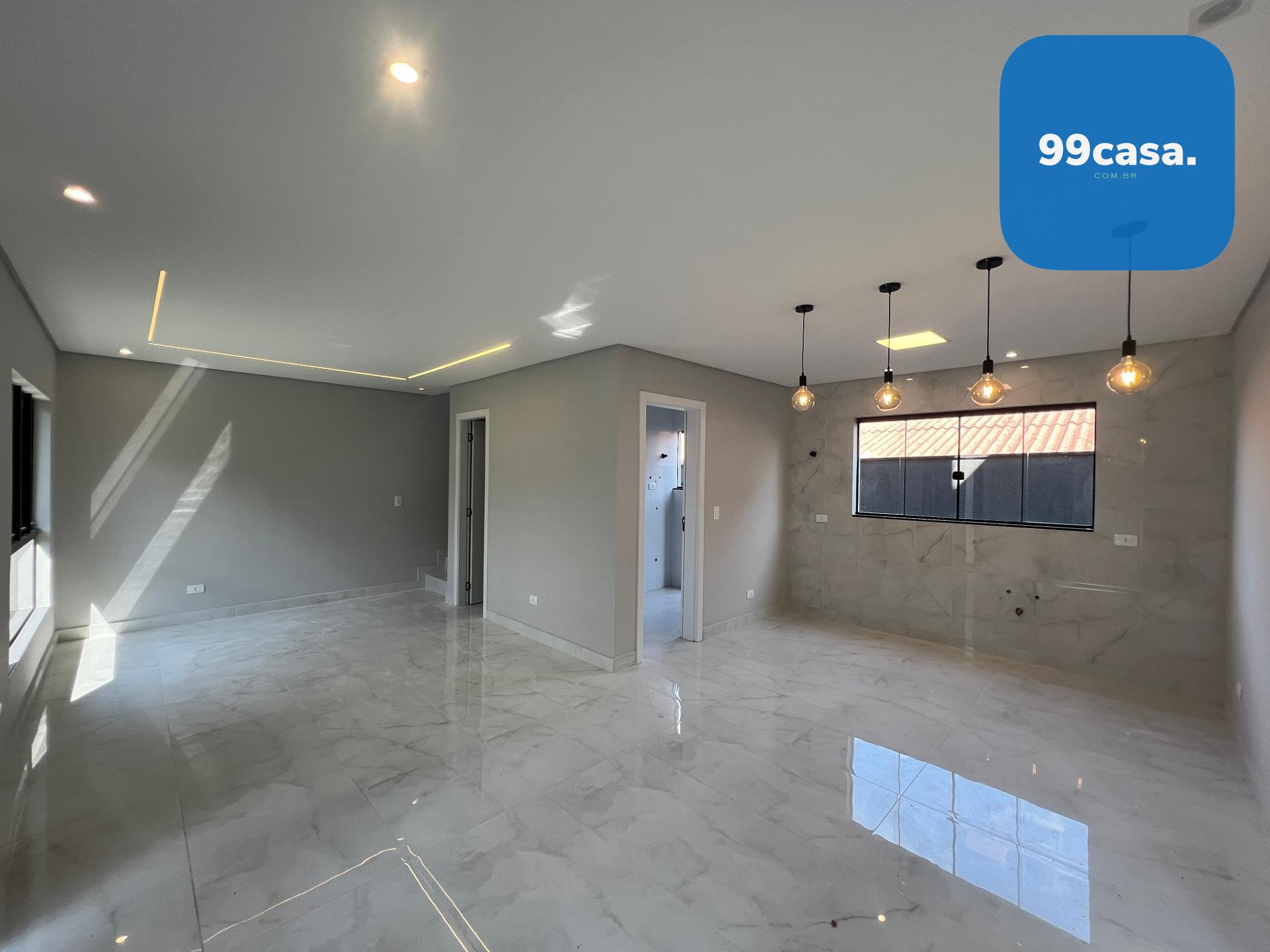 Pavimento térreo com sala para dois ambientes, cozinha com acabamento em porcelanato, lavanderia e lavabo.