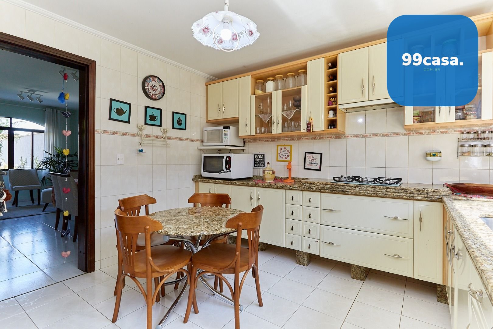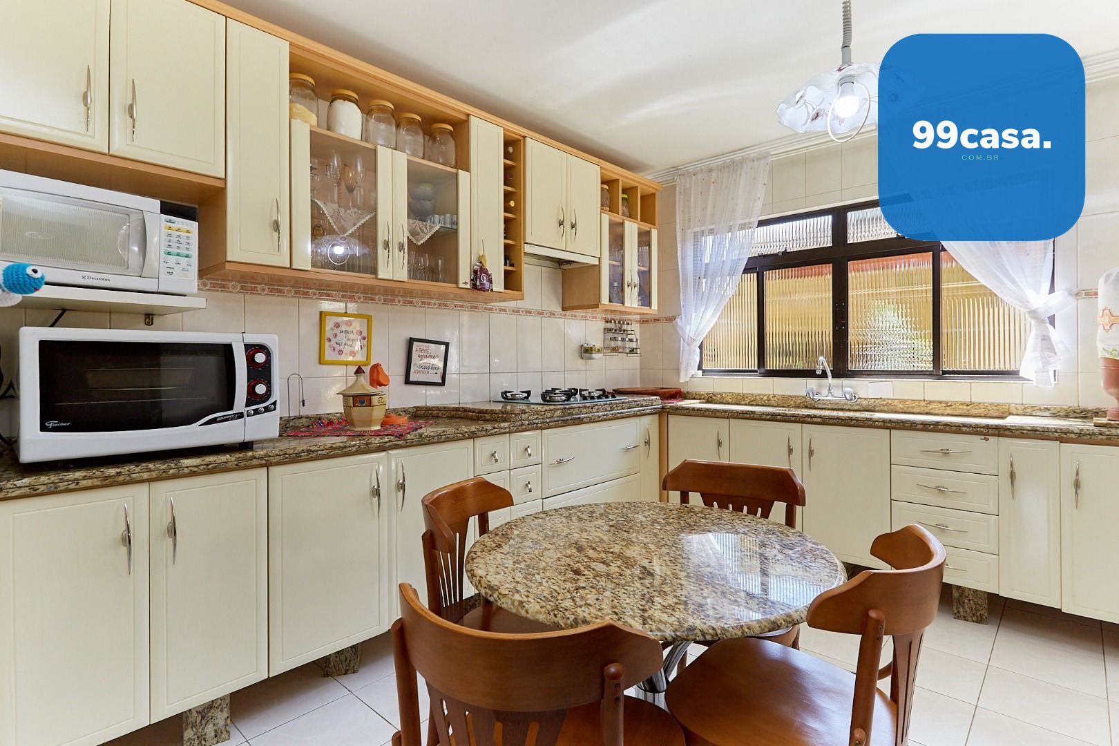 Cozinha com armários planejados e área de serviço bem ventilada.
